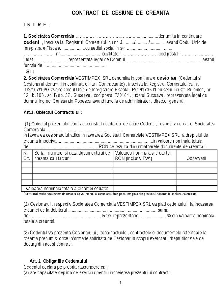 Contract De Cesiune De Creanta. Rezoluțiunea unilaterală a contractului de cesiune de creanță, în condițiile existenței unei clauze compromisorii și procedura insolvenței. Societatea la care lucrez a incheiat un contract de cesiune creante, societatea noastra are calitatea de cedent. Documents similar to contract de cesiune de creanta. A) se considera ca cesiunea creantei de catre cedent reprezinta o operatiune scutita de tva in daca operatiunea de cesiune a drepturilor si obligatiilor din contractul de inchiriere conform contractului de cesiune se incadreaza la pct. Descarca gratuit sau free download acest model de contract de cesiune de creante ( vanzare cumparare de creante ) din baza de date cu modele de contracte insa il poti folosi doar pentru uzul intern al unei.