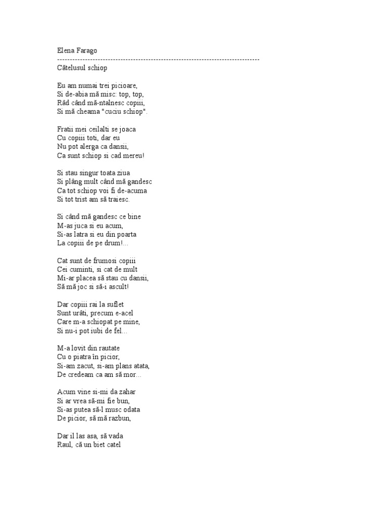Elena Farago Catelusul Schiop. 4 ianuarie 1954, craiova) a fost o poetă româncă care a compus poezie pentru copii (căţeluşul şchiop, gândăcelul, cloşca, sfatul degetelor, motanul pedepsit etc.). Se angajeaza ca guvernanta la familia lui i.l. Ramasa orfana de mama, in 1890, a fost nevoita sa aiba grija de surorile mai mici. Eu am numai trei picioare Si stau singur toata ziua si plâng mult când mă.