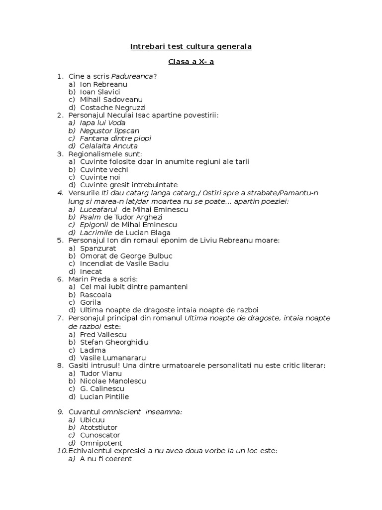 Test cultura generala academia nationala de informatii. Cultura generala reprezinta ansamblul structurat al rezultatelor materiale si spirituale ale activitatilor de transformare si adaptare a mediului natural si social la nevoile, trebuintele si aspiratiile oamenilor. Destept cultura generala iq intrebari si raspunsuri destept cultura generala iq toate intrebarile si raspunsurile jocul poate fi descarcat de pe google play.
